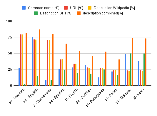 Some information (description, common name and URL) is language-dependent. You can set the preferred language in your request (English is the default). The chart below shows the percentage coverage of the top 10 languages (see this sheet for all languages).